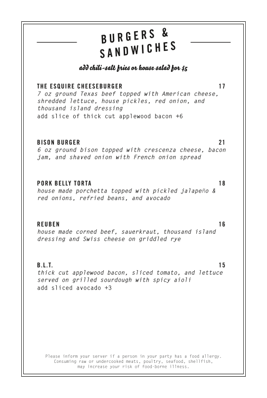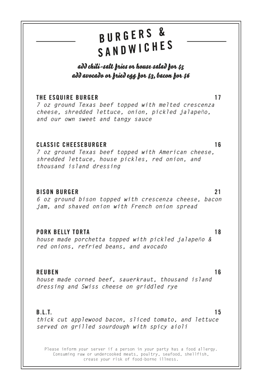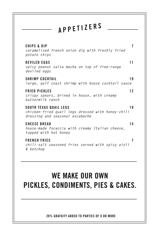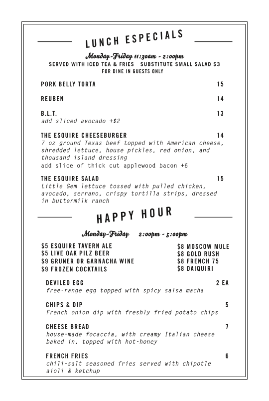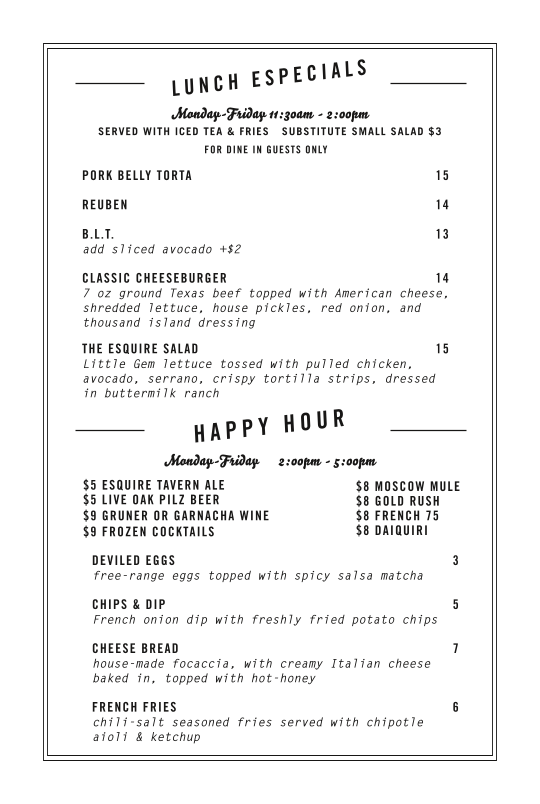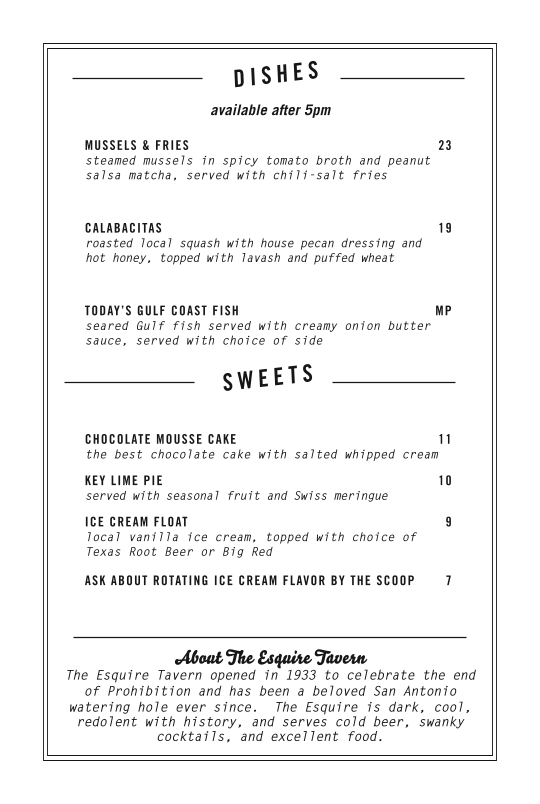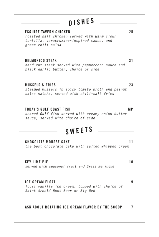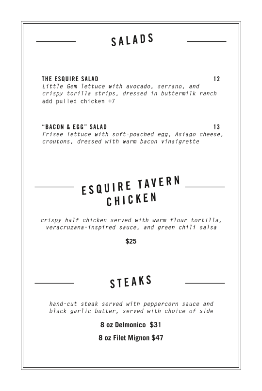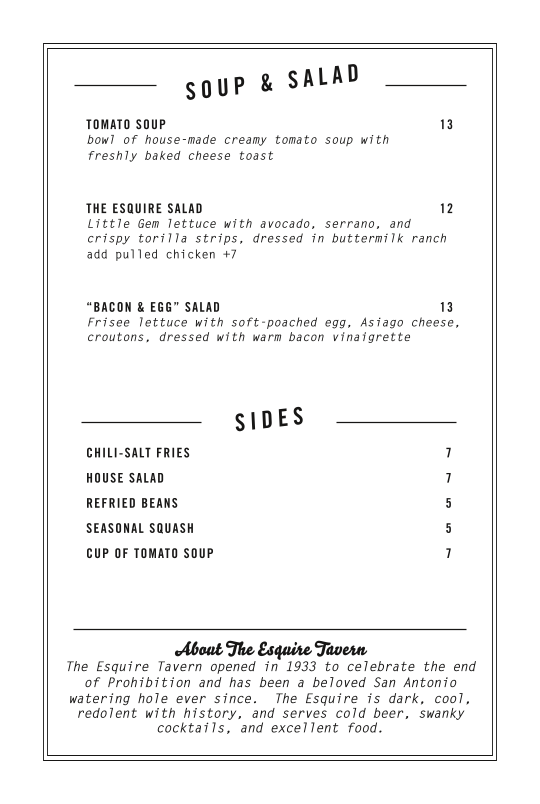 As for the main courses, the Texas Quail Legs fried to perfection and dressed with honey-chili dressing provide a unique twist that embodies Texas flavors. For lighter fare, the Esquire Salad featuring Little Gem lettuce, avocado, and crispy tortilla strips is a vibrant choice, equally delicious and refreshing. And let’s not forget the Housemade Focaccia, a perfect complement to any dish.