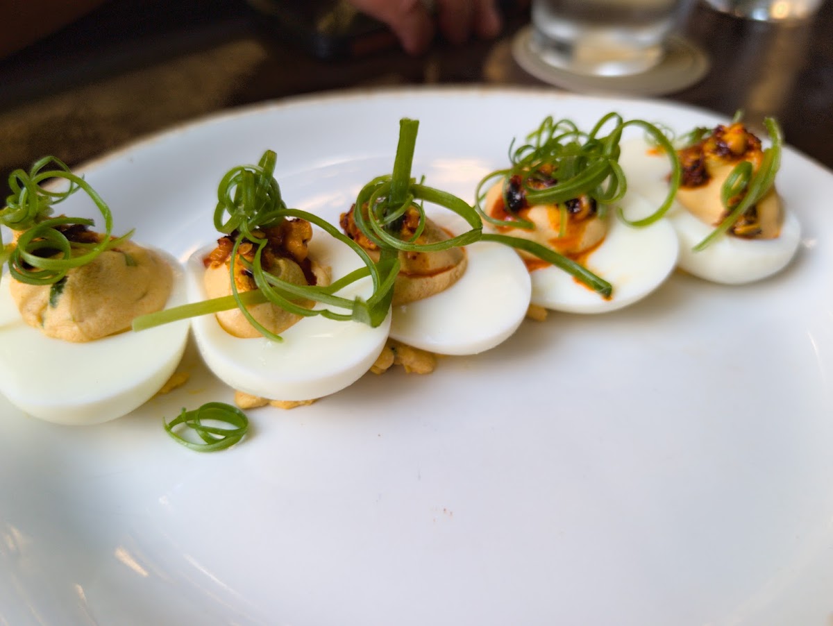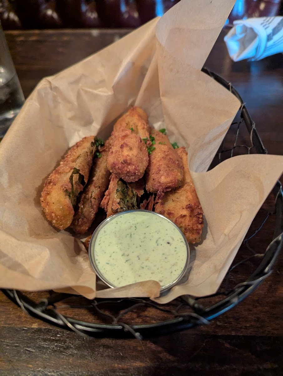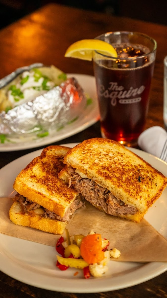 The drink menu is extensive, featuring specially crafted cocktails perfect for any palate. Dive into refreshing options like the Walkin’ After Midnight or the seasonal Winter Martini. In addition to its impressive drink selection, The Esquire Tavern offers a concise yet delicious food menu that pairs beautifully with its cocktails. Start your culinary journey with the Caramelized French Onion Dip served with freshly fried potato chips—each bite is a delightful blend of creamy and savory, perfect for sharing. Perhaps the Deviled Eggs topped with spicy peanut salsa macha will tempt your palate, or try the Fried Pickles served with a side of creamy buttermilk ranch for an addictive crunchy treat.